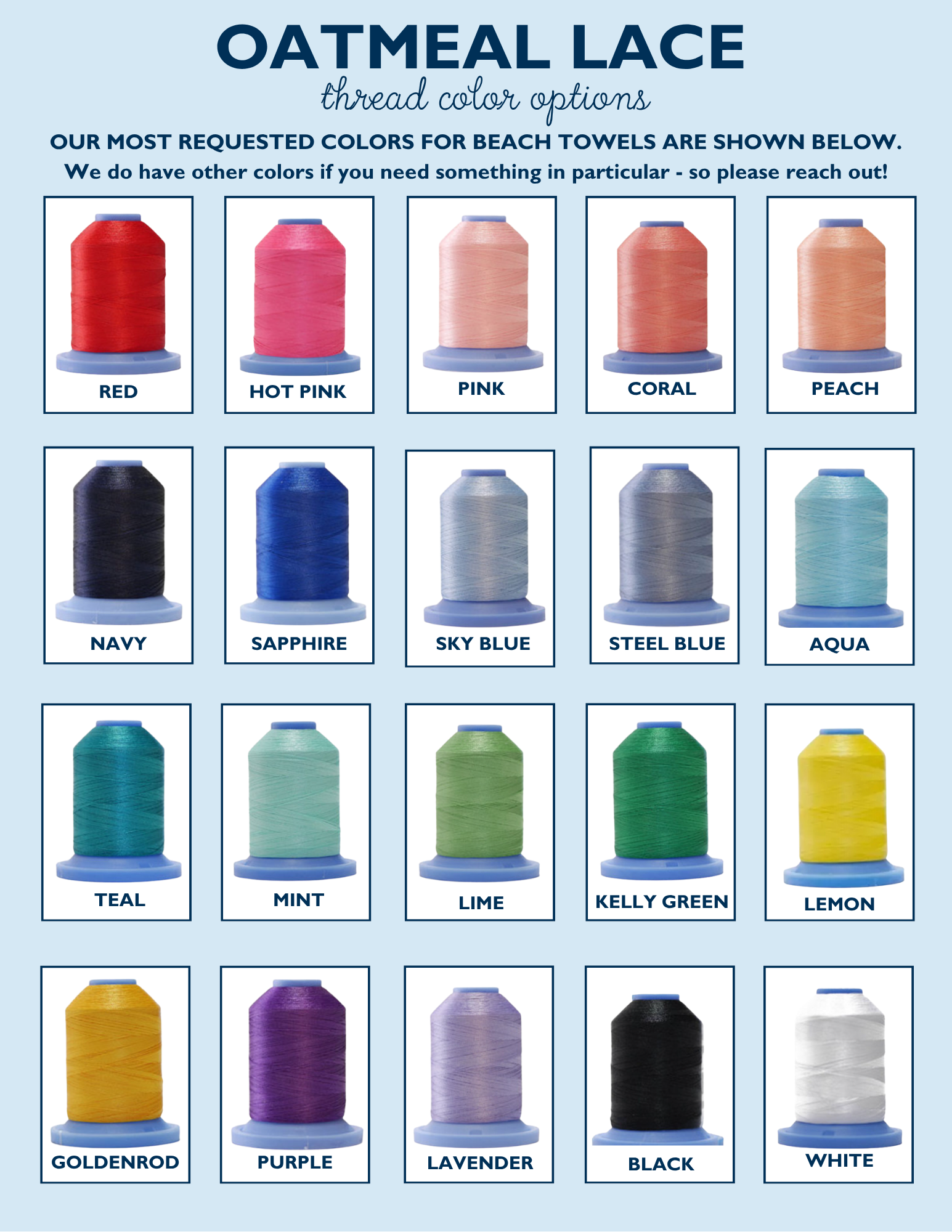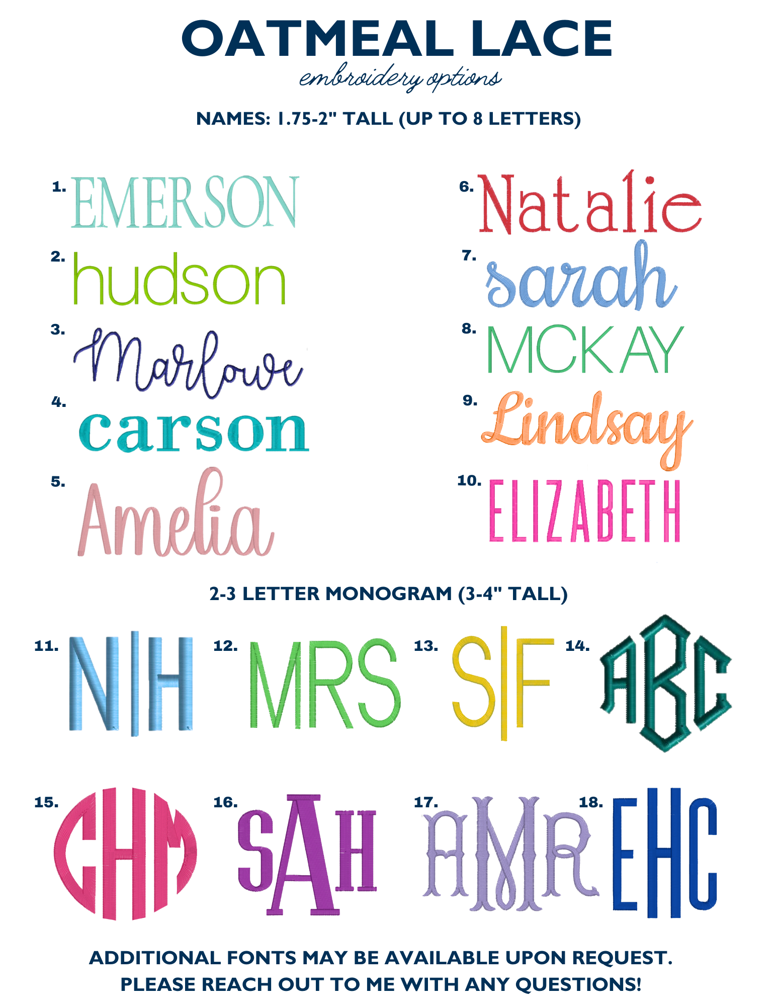 **Examples of all fonts embroidered on the towels are in my TOWEL highlight on Instagram @oatmeallace, or click the link HERE.